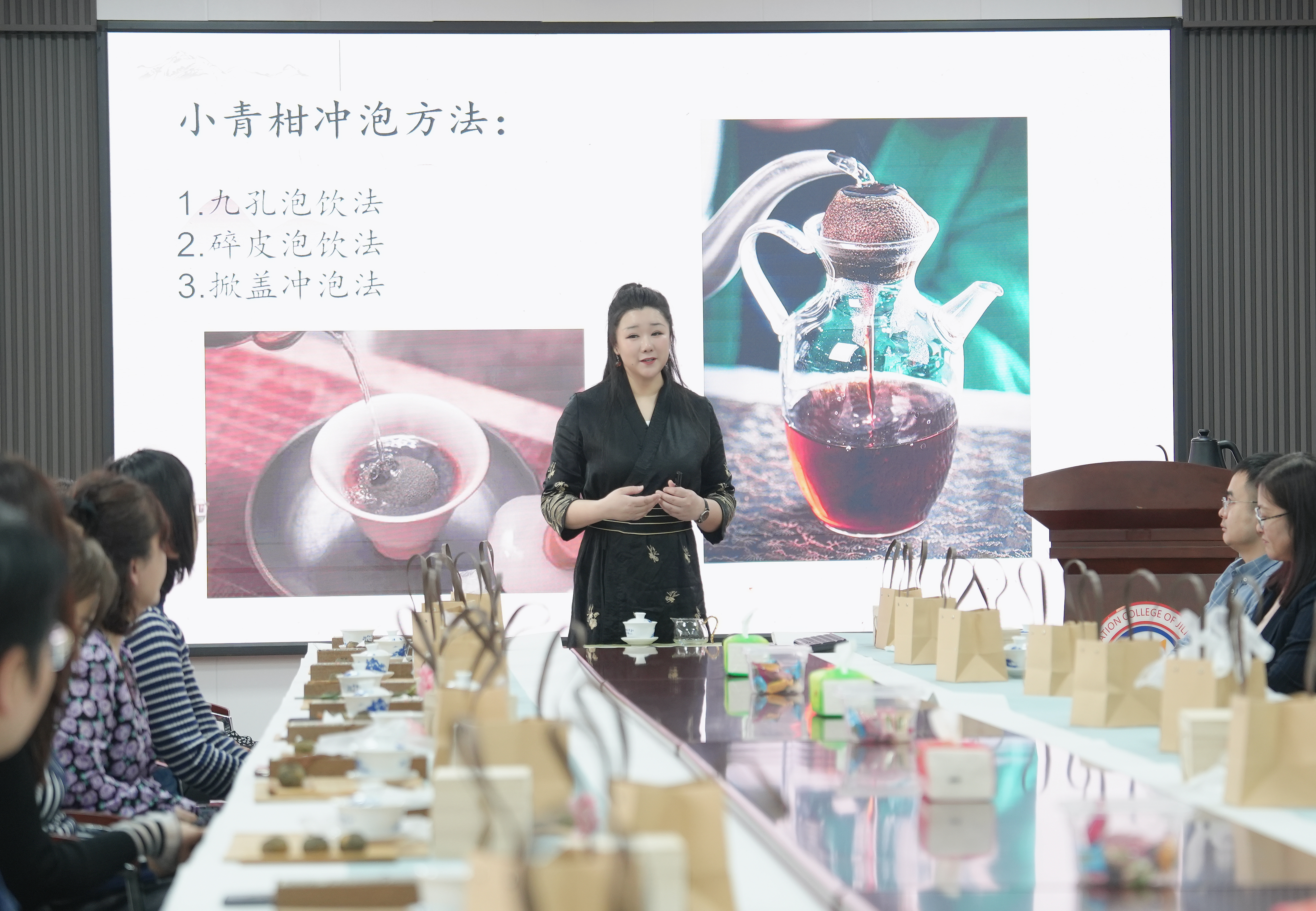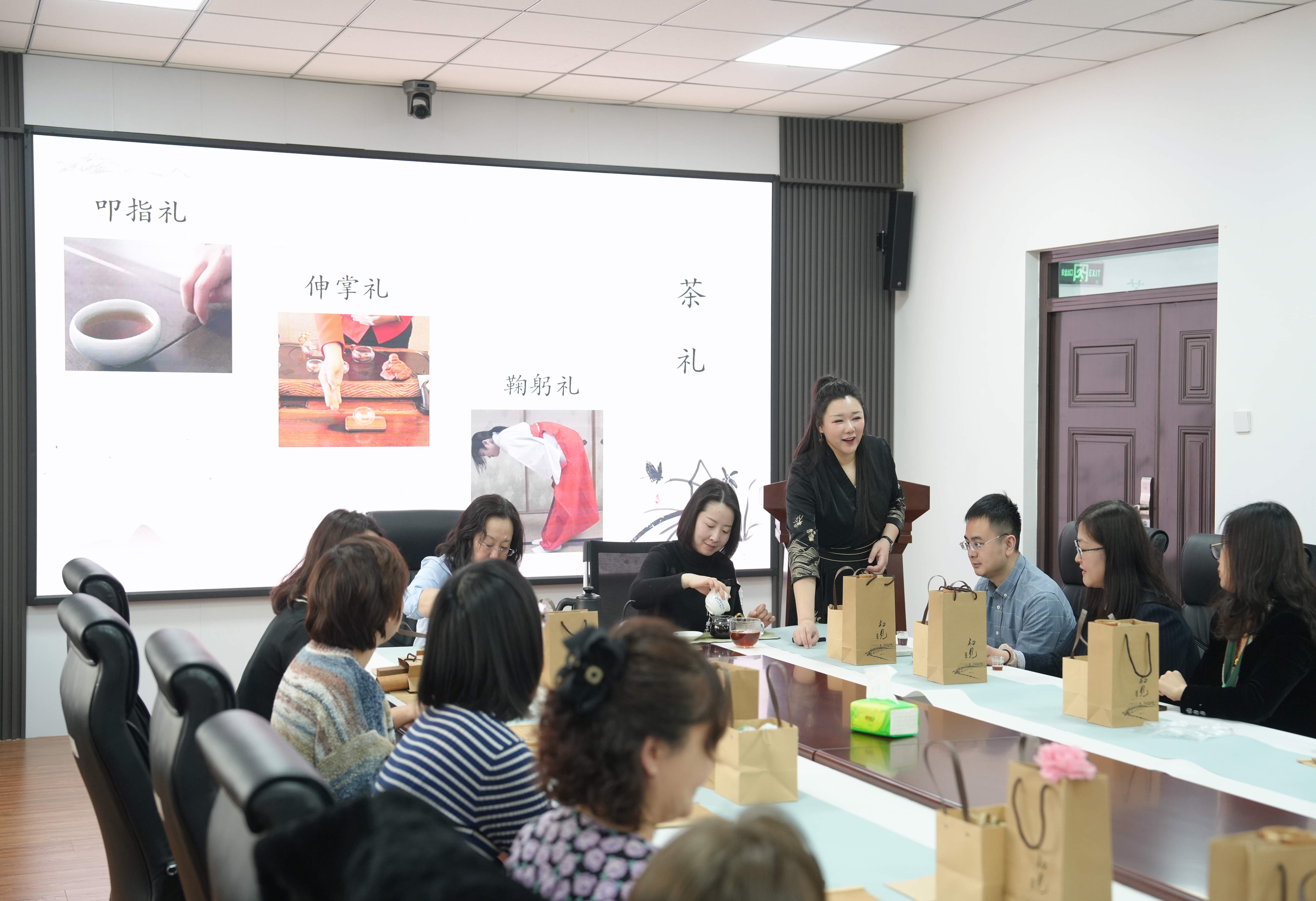 活动伊始,冯老师分享了茶道的历史渊源,介绍了红茶、绿茶、青茶、黄茶、黑茶和白茶中国六大茶及其特点,详细解说了茶道的发展历程、不同时期的茶文化特色,使老师们对茶的起源和演变有了更深刻的了解,在商务场合如何运用茶道礼仪,展现自己的风度和亲和力。